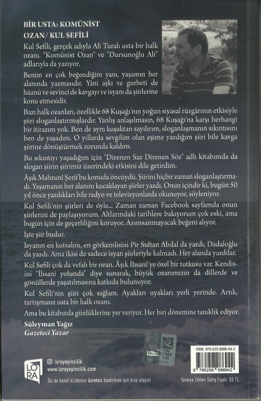 Okumakta olduğunuz dizelerin yazarı Ozan Kul Sefili işte bu önemli sürecin temsilcilerinden. Okuduklarınız, salt O’nun düşünce ve duyguları değil. O, gaipten gelen sesleri de yansıtmıyor. Kul Sefili, bizim sesimiz, yüreğimiz, bilincimiz, sevgimiz, özlemlerimiz, acılarımız, en çok da öfkemiz, isyanımız. O bize bin yıllık birikimiyle Anadolu’yu getiriyor. Kitabının sayfalarında, içinde yaşadığımız kör kuyuların karanlığında, ışık huzmelerini görüyorsunuz. Amerika’lı romancı Nathaniel Hawthrone, “dünya bütün ilerleme dürtülerini huzursuz insanlara borçludur. Mutlu insan kaçınılmaz olarak kendini eskinin sınırları içine hapseder” demiş.