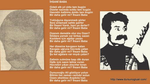 Ani bir kararla sessiz sedasızBizleri sensiz bıraktın İhsaniBu gidişin neydi bizden habersizKalbimiz acıyor yaktın İhsaniYapacağın işler bittimi sandınSosyalisttin sen bilime inandınİşçi sınıfına sadık olandınOrdan gönüllere aktın İhsaniSevgin yüreğime inan baş olduTürkülerin hep dillerde marş olduÖlüm haberinle gözüm yaş olduKalbime bir mermi sıktın İhsani İşçi sınıfında bir nefer idinZalimden korkmayan gerçek er idinMayısta gelirim Ali der idinBekledim gelmedin yoktun İhsaniSöylesene üstat acelen nedenSeni sevenlere haber etmedenAltıncı filoya kafa tutan senÖlümü koluna taktın İhsani Kul Sefili seni örnek almıştıİnan senin ilmin ile dolmuştuAradığı yolu sende bulmuştuYolumu çıkmaza soktun İhsani Komünist Ozan