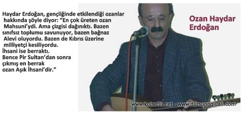 Haydar Erdoğan, gençliğinde etkilendiği ozanlar hakkında şöyle diyor: “En çok üreten ozan Mahsuni’ydi. Ama çizgisi dağınıktı. Bazen sınıfsız toplumu savunuyor, bazen bağnaz Alevi oluyordu. Bazen de Kıbrıs üzerine milliyetçi kesiliyordu. İhsani ise berraktı. Bence Pir Sultan’dan sonra çıkmış en berrak ozan Aşık İhsani’dir.”